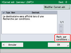 Si [Rech. auto si utilisation serveur LDAP] est réglé sur "Non", l'écran présentant la liste des destinataires reste vide jusqu'à ce qu'une recherche soit effectuée.