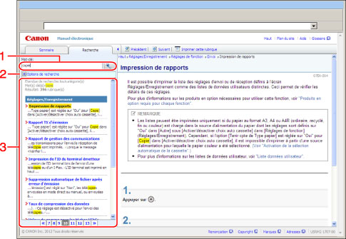 Les résultats de la recherche du mot-clé sont affichés. Si la recherche donne plus de 10 résultats, il est possible de les parcourir à l'aide des boutons [« Préc] et [Suiv »], ou des numéros qui s'affichent sous les résultats. |