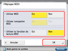 <Utiliser navigation WSD> est automatiquement défini sur "Oui" si [Oui] est sélectionné pour <Utiliser WSD>. Il est alors possible d'obtenir des informations concernant la machine via WSD.