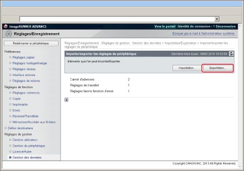 Cliquer sur [Réglages du périphérique (réglages de transfert, carnet d'adresses, réglages des favoris de la fonction d'envoi)] pour <Importation/Exportation individuelle> → [Exportation...].