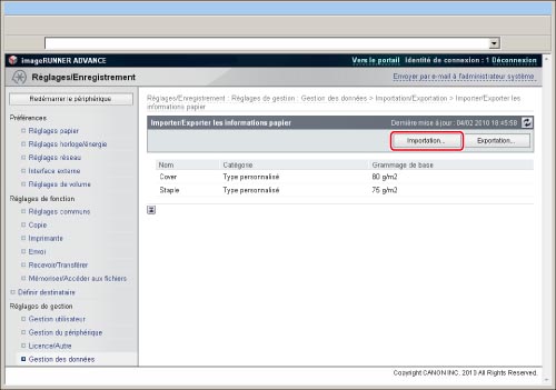 Si l'on importe une Liste d'adresses (Supprimer et remplacer) ou les réglages de transfert, les informations stockées sous [Réglages favoris] à partir du panneau de commande de la machine et la fonction Rappel sont supprimées.