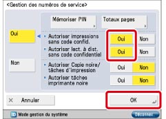 Les paramètres <Autoriser impressions sans code confid.> et <Autoriser lect. à dist. sans code confidentiel> ne sont activés que si la machine propose les fonctions d'impression et de lecture à distance.