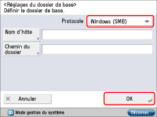 Les informations saisies aux étapes 6 à 9 de Réglages administrateur sont affichées dans [Nom d'hôte] et [Chemin du dossier].