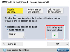 On peut utiliser des dossiers personnels sans spécifier les informations d'authentification pour chaque utilisateur si les conditions ci-dessous sont remplies. Dans ce cas, désélectionner [Util. infos auth. pour chq utilis.].