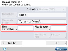 Les informations de dossier personnel obtenues à partir du service de connexion sont affichées sous [Nom d'hôte] et [Chemin du dossier].