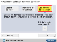 On peut utiliser des dossiers personnels sans spécifier les informations d'authentification pour chaque utilisateur si les conditions ci-dessous sont remplies. Dans ce cas, désélectionner [Util. infos auth. pour chq utilis.].