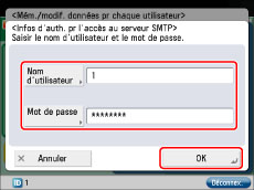Saisir le nom d'utilisateur et le mot de passe utilisés pour l'authentification de serveur SMTP → appuyer sur [OK].