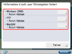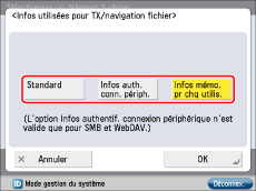 Utilise les informations pour l'authentification du serveur de fichiers définies dans la machine. (Voir "Mémorisation de l'adresse d'un serveur de fichiers".) D'autres réglages ne sont pas requis pour chaque utilisateur.