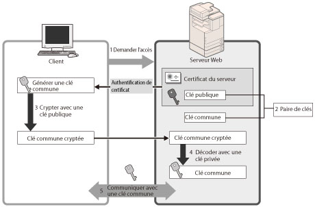 Il est possible de disposer d'une communication cryptée sûre lorsque l'utilisateur accède à la machine via un navigateur Web en installant un certificat de serveur sur la machine. Avec les communications SSL, la clé commune qui peut uniquement être utilisée par l'utilisateur et la machine est générée à l'aide du certificat de serveur et de la clé publique. Il est ainsi possible d'éviter l'interception et le vol de données. Voir