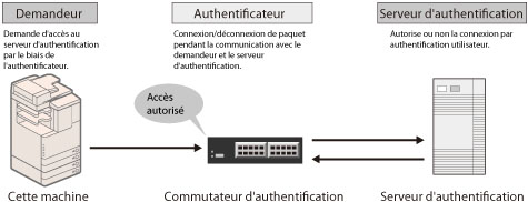 Gère toutes les informations d'authentification par l'intermédiaire du serveur d'authentification (RADIUS : Remote Authentication Dial In User Service, Service utilisateur entrant d'authentification à distance) et authentifie le requérant. Il est possible d'interdire un accès non autorisé parce que seul le demandeur authentifié par le serveur RADIUS est autorisé à se connecter au réseau par l'authentificateur.