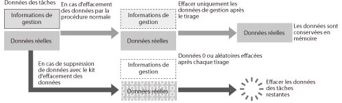 La machine sépare les données des tâches en informations de gestion et en données, et elle les stocke sous cette forme lors de la copie, de l'envoi, de la réception et de l'impression. Les informations de gestion sont effacées automatiquement une fois la tâche terminée, mais les données sont stockées dans la mémoire.
