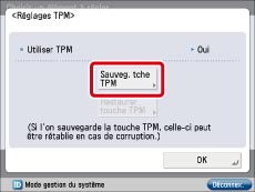 Avant l'activation du réglage TPM, l'administrateur système doit vérifier si les réglages par défaut du code admin. système et du PIN admin. système (réglages de l'administrateur système) sont modifiés. Si les réglages par défaut du code admin. système et du PIN admin. système ne sont pas modifiés, un utilisateur autre que l'administrateur peut effectuer des sauvegardes et la clé de sauvegarde TPM peut être prise. Etant donné que la clé TPM peut être sauvegardée une seule fois, il est impossible de la restaurer.