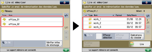 Pour utiliser l'espace de stockage réseau, il est nécessaire d'effectuer des réglages préalables en fonction des besoins. Pour plus d'informations, voir "Réglages réseau".