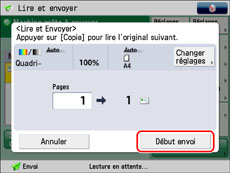 Il est possible également d'annuler une tâche d'envoi à partir de l'écran Moniteur statut/Annulation. (Voir "Annulation d'une tâche d'envoi en attente ou en cours de traitement".)