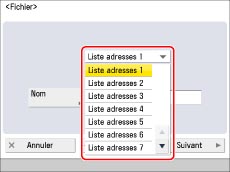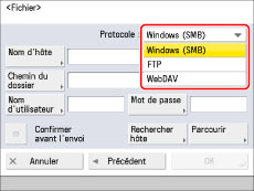 Si l'option [Activer/désactiver changt langue/clavier] est réglée sur "Oui", le nom d'hôte et le chemin du dossier du serveur de fichiers de destination risquent de ne pas s'afficher correctement ; il ne sera donc peut-être pas possible de les parcourir. (Voir "Activation/désactivation du changement de langue/clavier".)