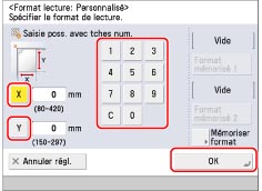 Appuyer sur [X] et [Y] → utiliser les touches numériques pour saisir le format de lecture en mm → appuyer sur [OK].