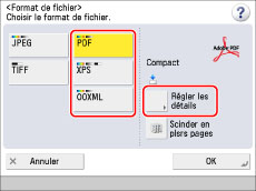 Si le format de fichier sélectionné est PDF ou XPS, il est possible de régler simultanément [Compact] et [OCR (rech. texte poss.)]. Dans ce cas, le format de fichier [PDF (Compact)] ou [XPS (Compact)] s'affiche dans l'écran des fonctions de base des modes lecture et envoi.