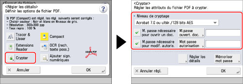 Si les réglages du mode PDF crypté sont rappelés en appuyant sur [Réglages préc.], le mot de passe n'est pas rappelé et les champs [M.passe ouvert. doc.] et [Mot passe autorisation] sont vierges.