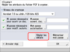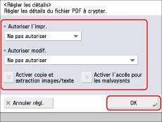 Il est possible de mémoriser les réglages des fichiers PDF cryptés dans les Réglages favoris. Ne pas saisir de mots de passe si l'on ne souhaite pas spécifier [M.passe ouvert. doc.] ou [Mot passe autorisation] dans [Réglages favoris].
