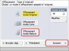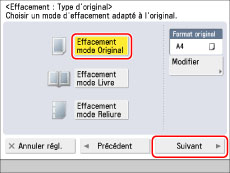 Le mode Effacement mode Original ne peut être spécifié que pour les originaux dont le format apparaît sur l'afficheur tactile.
