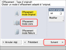 Le mode Effacement mode livre ne peut être spécifié que pour les originaux dont le format apparaît sur l'afficheur tactile.