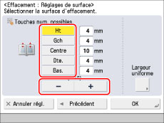 Appuyer sur [Centre] et [Côtés] → appuyer sur [-] ou [+] pour définir leur largeur d'effacement respective.