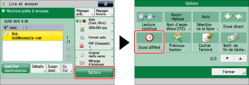 Il est possible de vérifier le statut, d'annuler ou de modifier les destinataires des documents pour lesquels une heure d'envoi différé a été définie. (Voir "Opérations à partir de l'écran Envoyer".)
