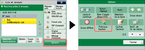 Spécifier le destinataire → appuyer sur [Options] → [Prévisualisation].