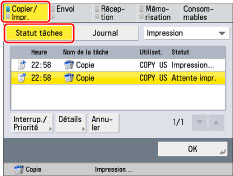 Affiche des informations détaillées sur la tâche sélectionnée. Vérifier les informations détaillées → appuyer sur [OK] pour revenir à l'écran Copier/Imprimer.