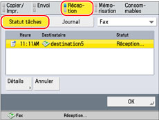 Affiche des informations détaillées relatives à la tâche sélectionnée. Vérifier les informations détaillées → appuyer sur [OK] pour revenir à l'écran Réception.