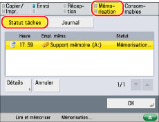 Affiche des informations détaillées relatives à la tâche sélectionnée. Vérifier les informations détaillées → appuyer sur [OK] pour revenir à l'écran Mémoriser.