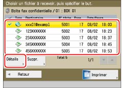 Vérification des informations détaillées/suppression d'un fichier stocké dans une boîte fax confidentielle