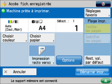 Il est nécessaire de définir <Utiliser fonction lecture/impression> dans [Utiliser fonction d'impr.] sur "Non" pour imprimer un fichier du support mémoire. (Voir "Réglages du support mémoire".)