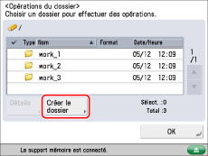 Sélectionner le support mémoire souhaité → sélectionner le niveau de dossier souhaité → appuyer sur [Opérations du dossier].
