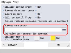 Pour plus d'informations sur la modification des réglages proxy de la machine, voir "Réglages communs à TCP/IPv4 et TCP/IPv6".