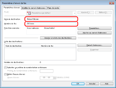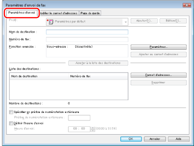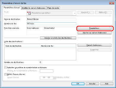 Si l'on a sélectionné [Ressaisir le nº de fax avant d'ajouter la destination à la [Liste des destinations]] dans la boîte de dialogue [Paramètres de sécurité] de l'onglet [Spécial], la boîte de dialogue [Confirmer le mot de passe] s'affiche lorsque l'on clique sur [Ajouter à la liste des destinations]. Pour plus d'informations, voir l'aide en ligne (voir " Affichage de l'aide en ligne").