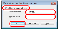 Sélectionner [Utiliser la sous-adresse] → saisir la sous-adresse et le mot de passe dans [Sous-adresse] et [Mot de passe] → cliquer sur [OK].