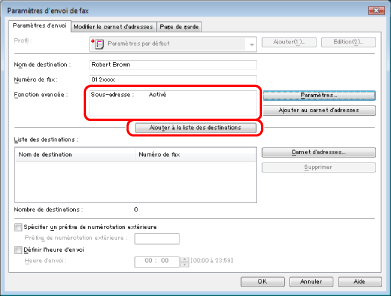 Il est possible d'envoyer des télécopies via la fonction de sous-adresses uniquement lorsqu'un périphérique équipé d'une carte de télécopie intégrée est disponible.
