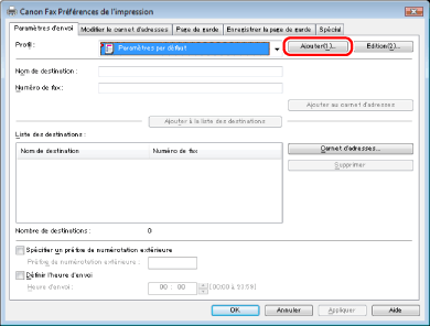 Configurer les paramètres souhaités dans les onglets [Paramètres d'envoi], [Page de garde] et [Spécial] → cliquer sur [Ajouter].