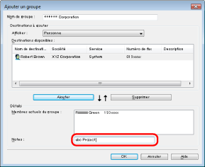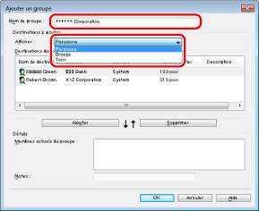Il est également possible de modifier les données de groupes destinataires précédemment enregistrés. Pour plus d'informations, cliquer sur [Aide] dans l'angle inférieur droit de la fenêtre du pilote de télécopie pour afficher l'aide en ligne.