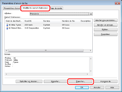Si l'on a sélectionné [Protéger par mot de passe lors de l'exportation de la liste d'adresses] dans la boîte de dialogue [Paramètres de sécurité] de l'onglet [Spécial], une boîte de dialogue permettant la saisie d'un mot de passe s'affiche lorsque l'on clique sur [Exporter]. Pour plus d'informations, voir l'aide en ligne (voir "Affichage de l'aide en ligne").