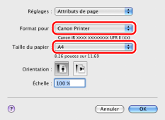 Sous Mac OS X 10.5 et ultérieur, il se peut que la boîte de dialogue [Format d'impression] n'apparaisse pas, en fonction de l'application utilisée. Si c'est le cas, spécifier les réglages ci-dessous à partir de la boîte de dialogue [Imprimer] à laquelle on accède par le biais de l'option [Imprimer] du menu [Fichier].