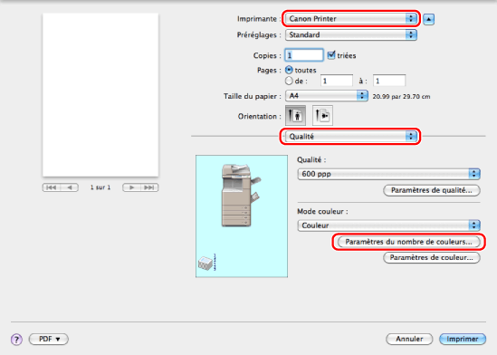 Sélectionner l'imprimante → [Qualité] → cliquer sur [Paramètres du nombre de couleurs].