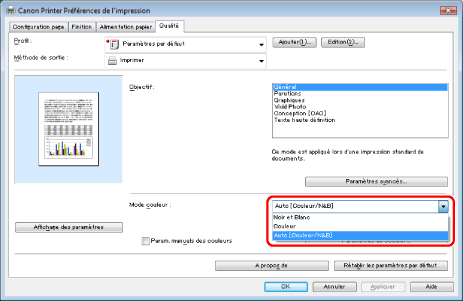 Définition d'un mode couleur pour l'impression