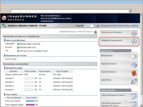 → [Réglages de gestion] → [Licence/Autre] → régler [Interf. util. dist.] sur "Oui".|