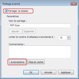Sous Windows Vista/Windows 7, cliquer avec le bouton droit sur le dossier "PDF-Scan" → sélectionner [Propriétés] pour afficher la boîte de dialogue [Propriétés de PDF-Lecture] → cliquer sur l'onglet [Partage] → cliquer sur [Partage avancé] → sélectionner [Partager ce dossier] → cliquer sur [Autorisations].