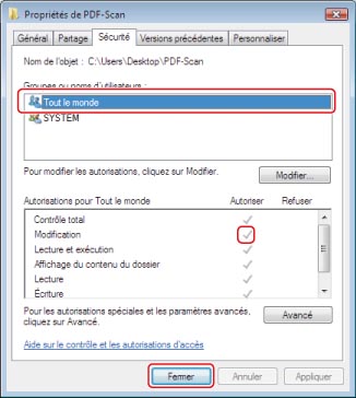Sous Windows XP, sélectionner [Tout le monde] → choisir [Autoriser] pour l'option <Modification> → cliquer sur [OK]. Sous Windows Vista/7, sélectionner [Tout le monde] → choisir [Autoriser] pour l'option <Modification> → cliquer sur [OK] → [Fermer].