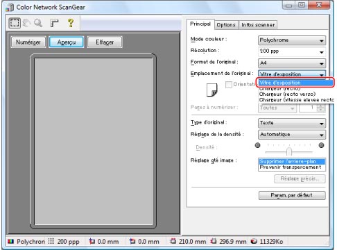 Cliquer sur l'onglet [Principal] → sélectionner [Chargeur (recto)] pour l'option [Emplacement de l'original].