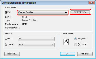 Sélectionner [Imprimer] dans le menu [Fichier] de l'application à partir de laquelle le document est imprimé → afficher la boîte de dialogue [Impression] → cliquer sur l'imprimante à utiliser → cliquer sur [Propriétés].