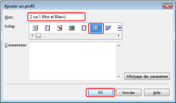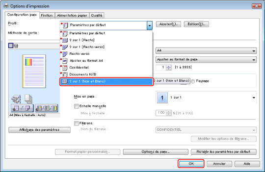 Dérouler la liste [Profil] → sélectionner [2 pages/sheet (B&W)] → cliquer sur [OK].